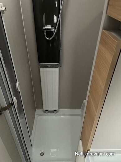 Asuntovaunu jossa on takana erillinen suihku ja WC