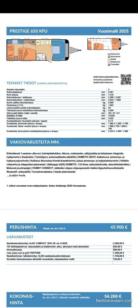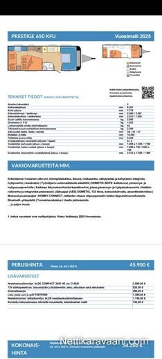 Nettikaravaani.com ei ota vastuuta myyjän antamien tietojen paikkansapitävyydestä. Ilmoitetuissa tiedoissa saattaa olla myös tahattomia puutteita tai virheitä. Tieto on siis sitova vasta kun myyjä on sen pyynnöstäsi vahvistanut.